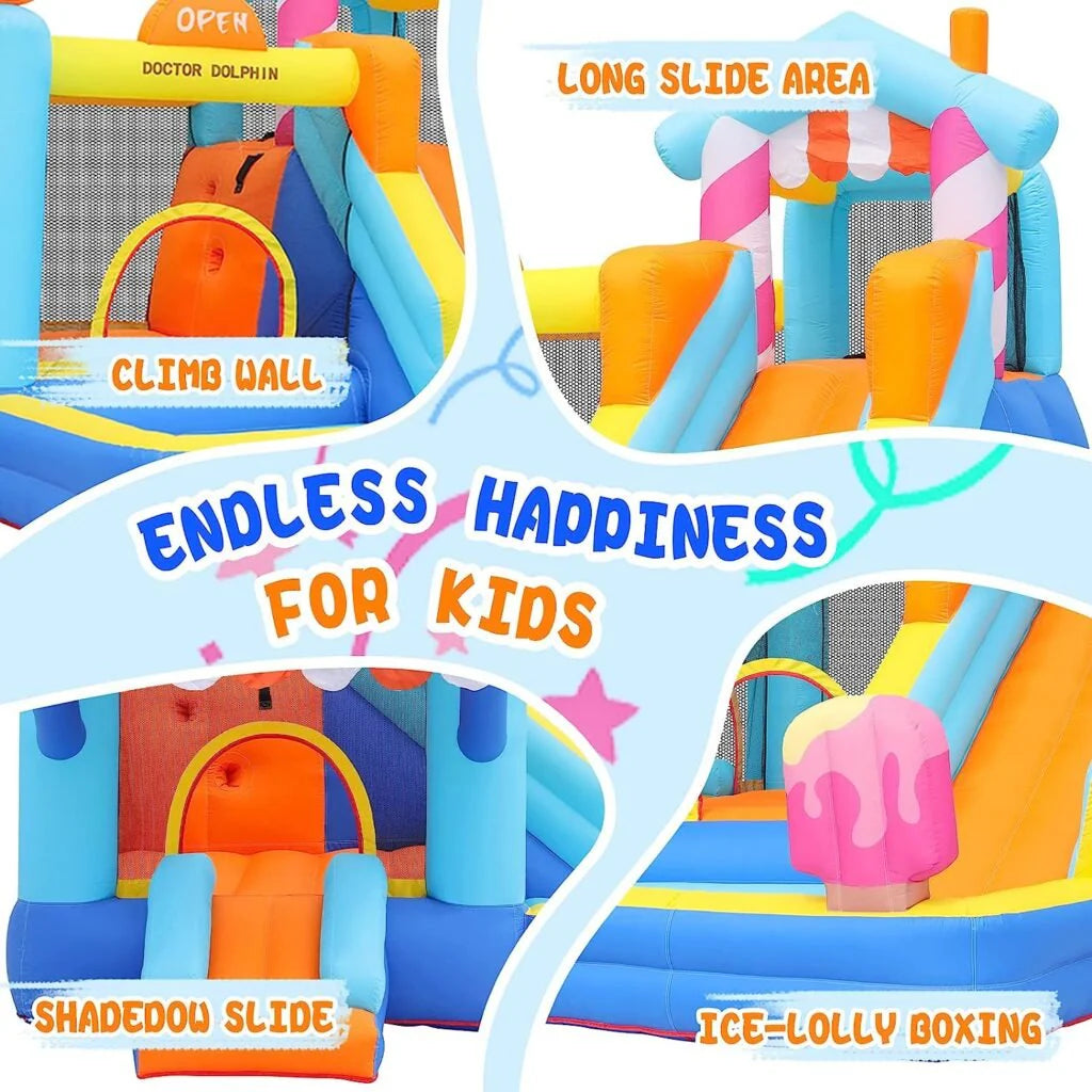This is a colorful, durable inflatable bounce house designed for safe, imaginative play. With its reinforced netting and padded floor, it delivers both fun and security for children.