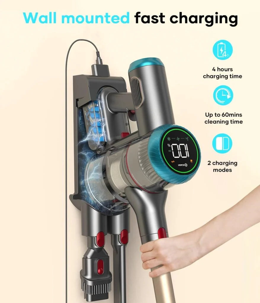 Up to 60 Minutes of Runtime:Â Equipped with a powerful 2500mAh 7-cell battery, the vacuum delivers up to 60 minutes of cleaning in Eco mode. It charges fully in just 4â5 hours using the included wall-mounted charging dock.