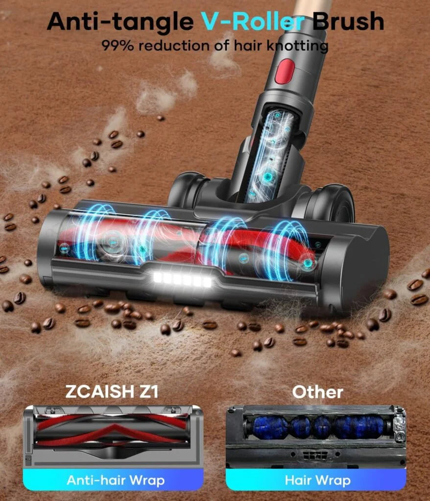 LED-Equipped, V-Shaped Anti-Tangle Brush: The V-shaped roller brush resists tangling and glides smoothly across all surfaces. A 180° flexible head and built-in LED lights help you clean under furniture, along baseboards, and in dark cornersâideal for pet owners.